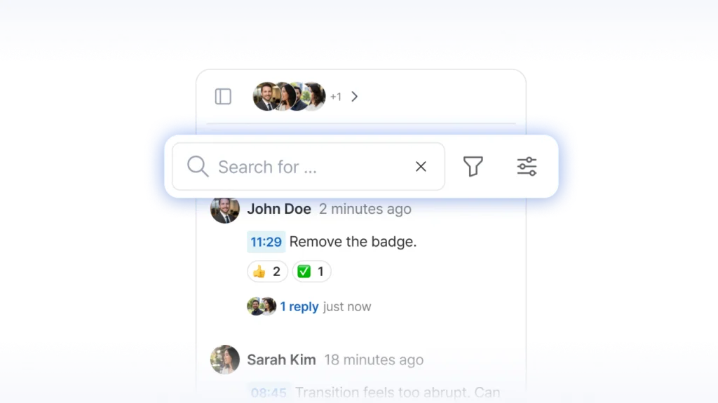 Search across all comments in a project. Filter by unresolved, by user, or by version — so you always know what still needs action.